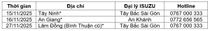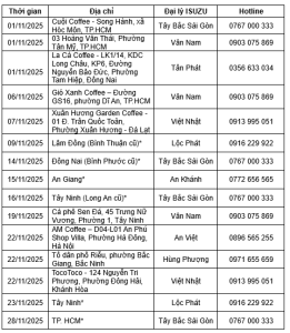 Hãy lưu lại lịch sự kiện Trưng bày & Lái thử xe tháng 11 – 2025 của ISUZU dưới đây và liên hệ với hotline của Đại lý để biết thêm thông tin chi tiết!